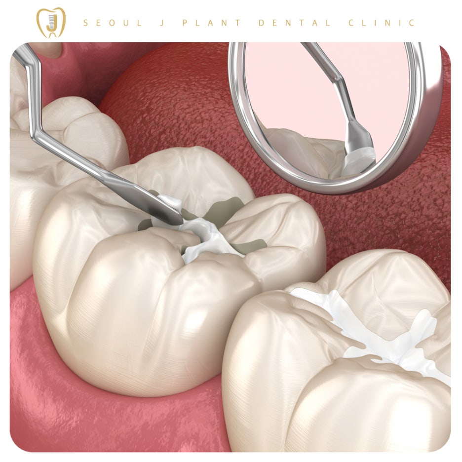 갉아 낸 다음 레진이나 GI(글라스 이오노머 Glass Ionomer, 치의학에서